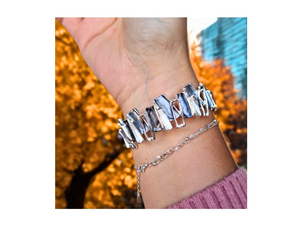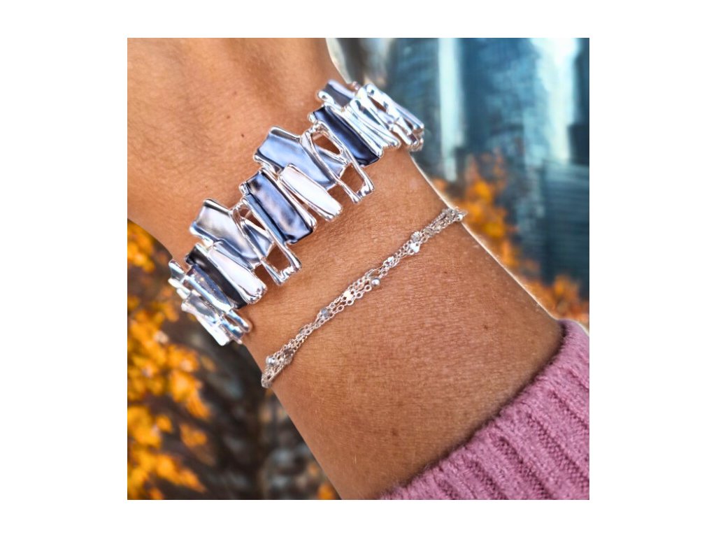 Tento elegantní náramek z kvalitní zinkové slitiny se stříbrným pokovením přináší šmrnc a originalitu každému outfitu.