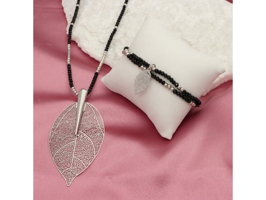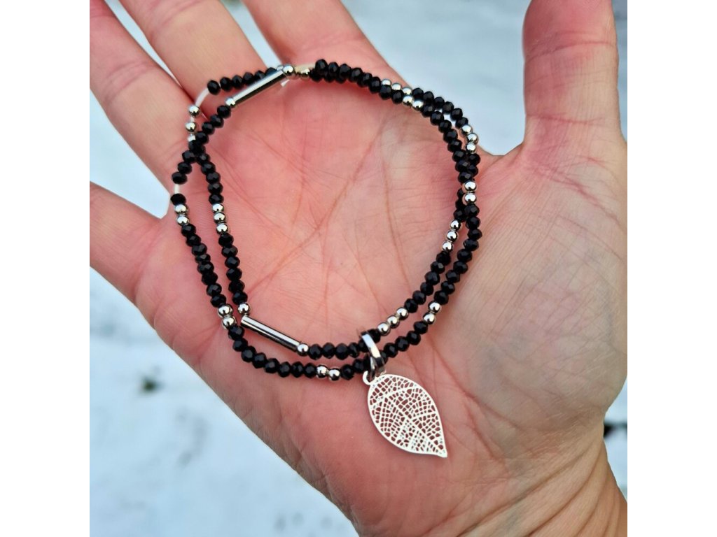 Náramek s podzimním listím - stříbrné komponenty - černý