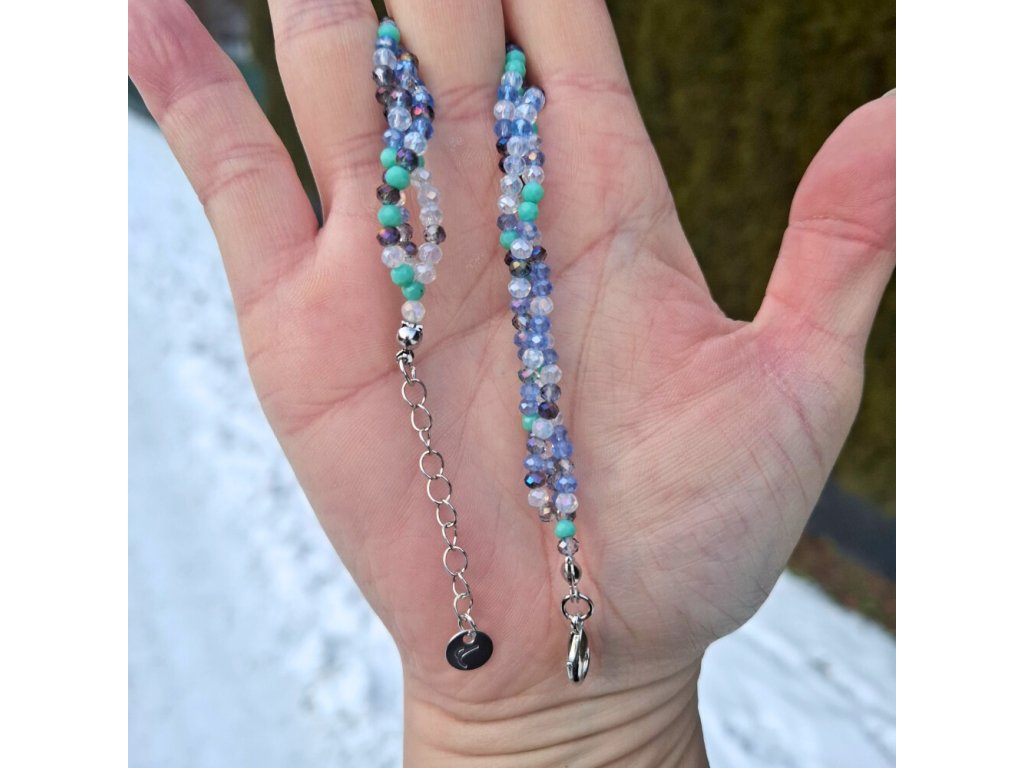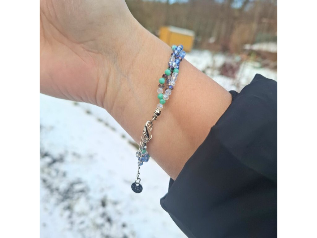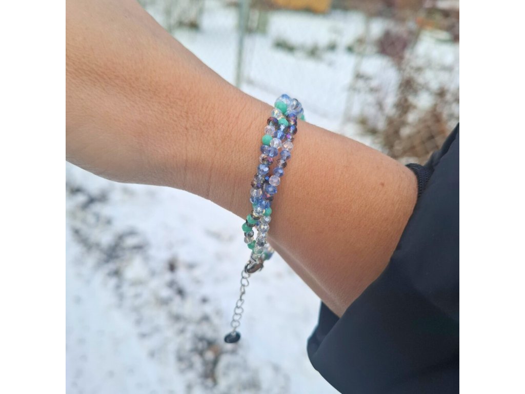 Náramek ze tří řad drobných, fazetovaných krystalů - stříbrné komponenty - zeleno modrá